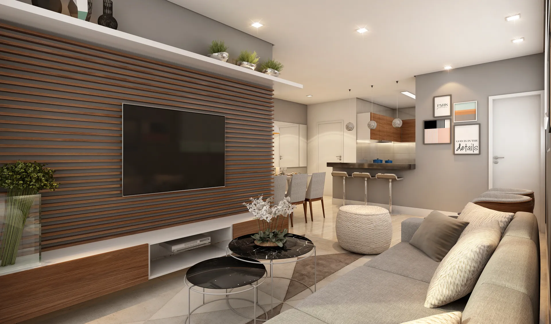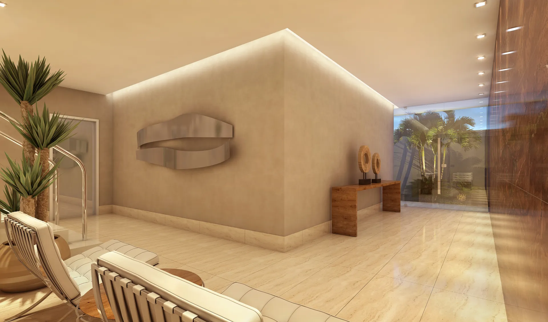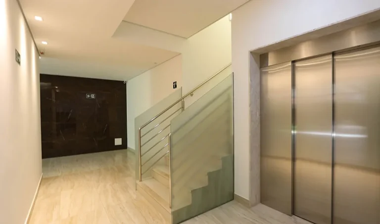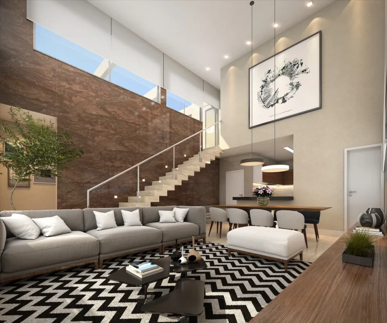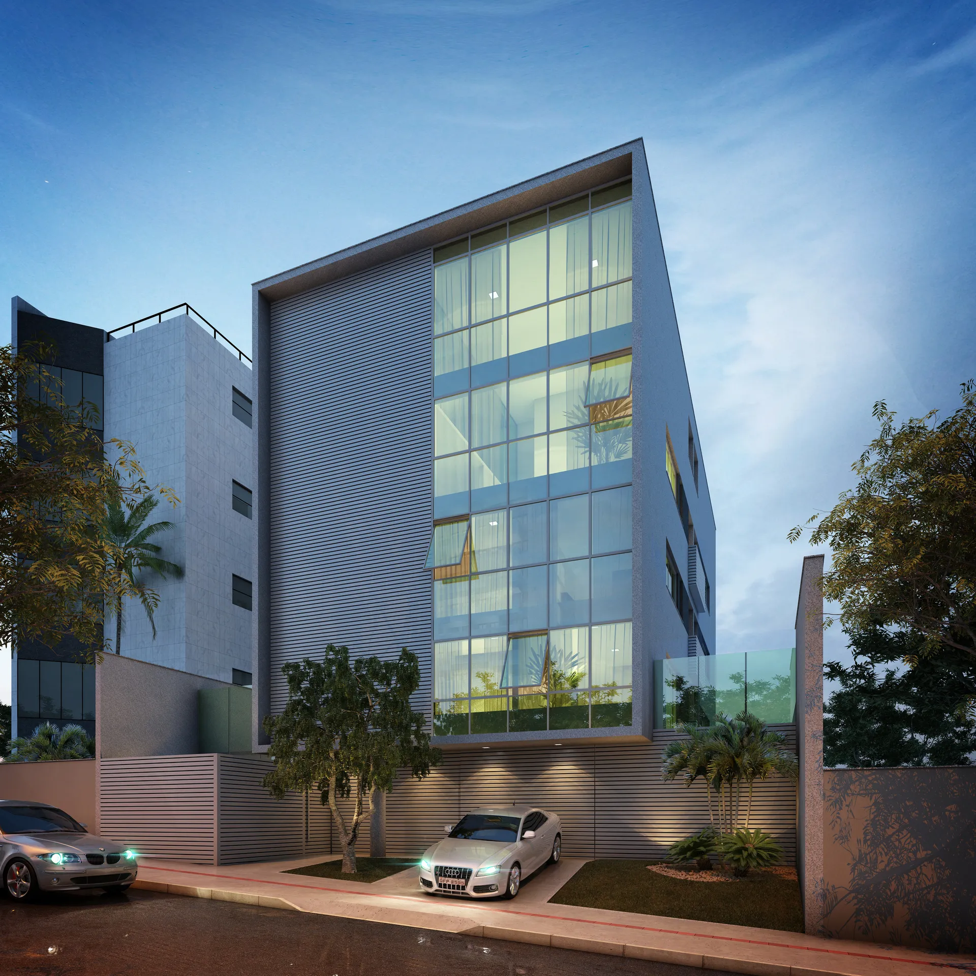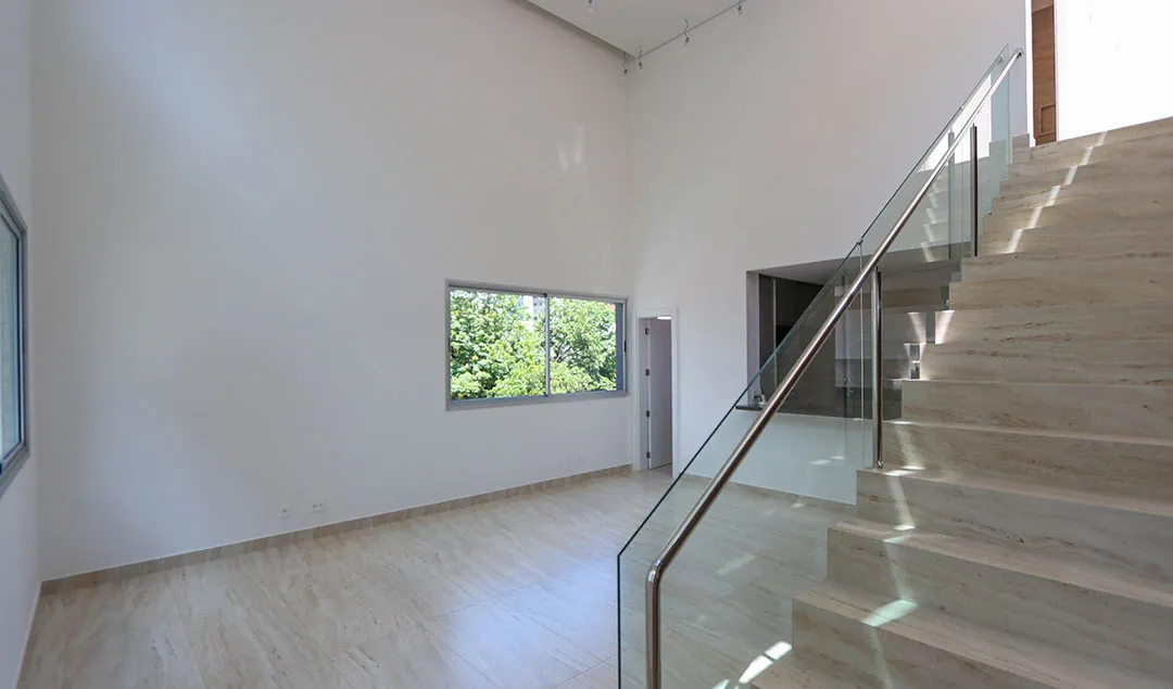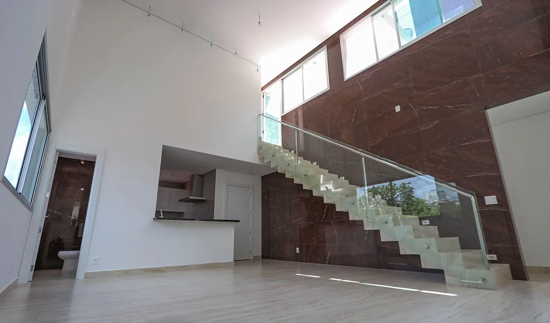 Porcelanato, piso vinílico, brise metálico e pele de vidro
